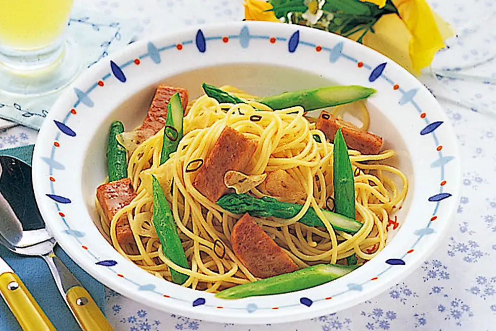 フライパンにオリーブ油、にんにく、唐辛子を入れて熱し、アスパラガスとポークを弱火で炒める