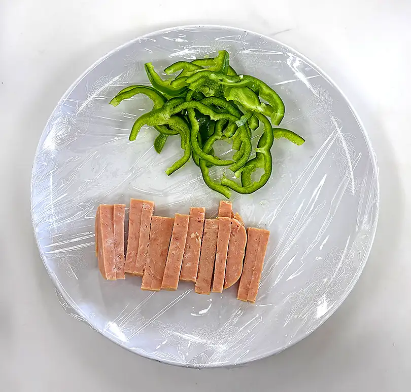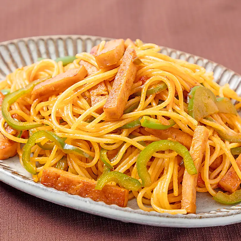 材料は、わしたポーク、パスタ麺、ピーマン、市販のナポリタンソースまたはトマトソース。お好みで具材を追加してもOK- 2