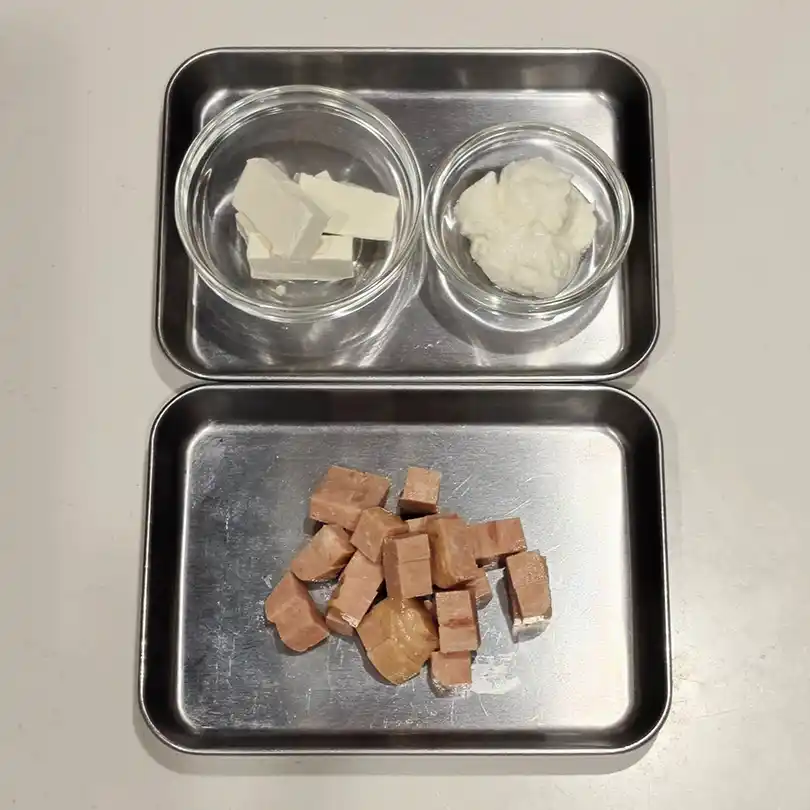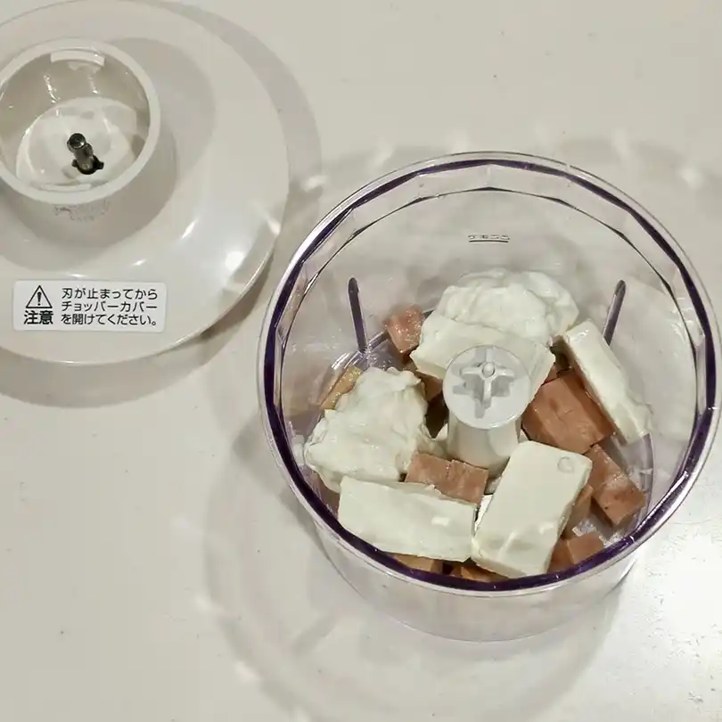 フードプロセッサーなど※①にわしたポーク、クリームチーズ、水切りヨーグルト※②を入れ、滑らかになるまで攪拌します。